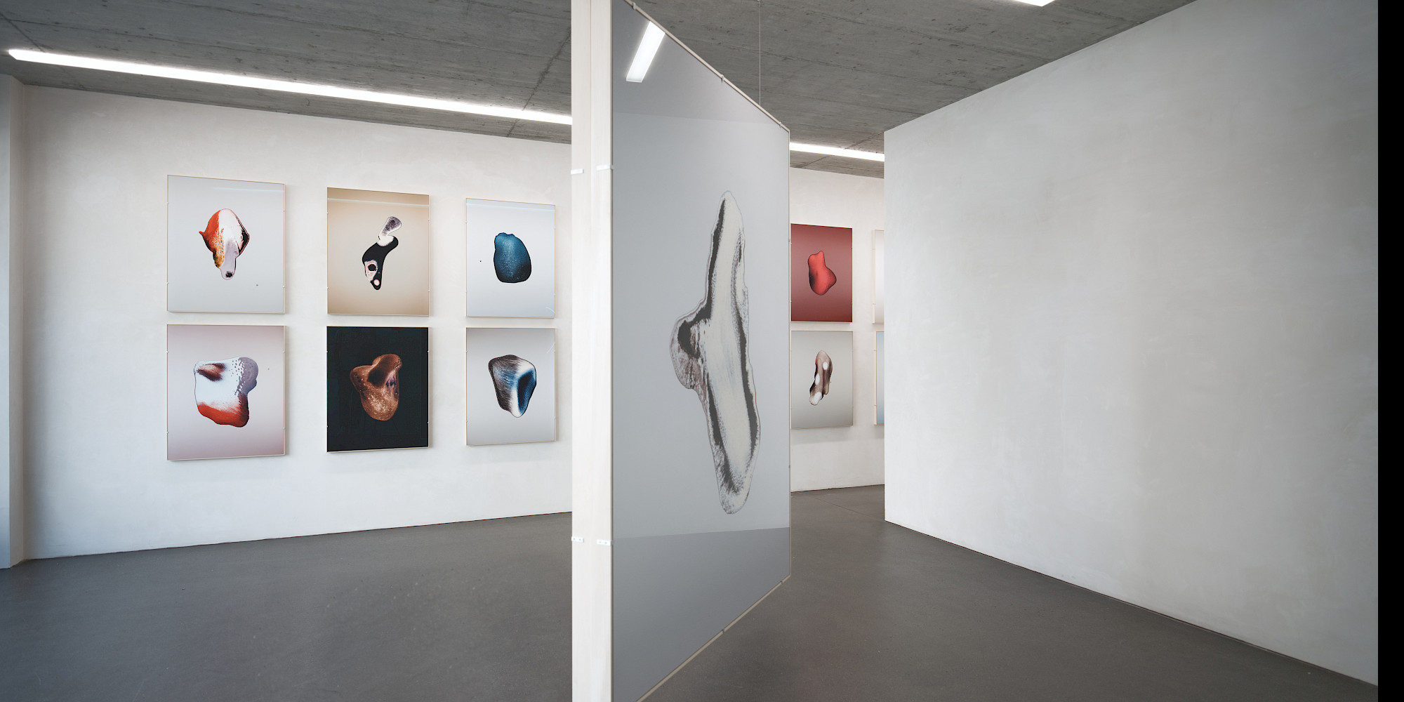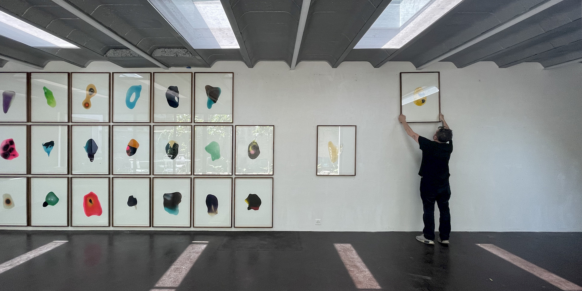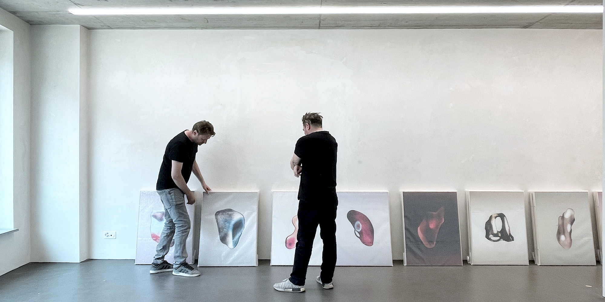 Über die Leinwand hinaus verfolgt er sein Interesse an Wahrnehmungsverschiebungen in den Spiegel-Anamorphosen: runde Kartonobjekte mit zentraler Spiegelfolie. Diese Objekte sind keine Abkehr von der Malerei, sondern eine Fortführung ihres Vokabulars – ein Experiment darüber, wie Bildordnung durch Material, Blickachse und Standpunkt entsteht und wie wenig es braucht, um zwischen Gegenständlichkeit und Abstraktion, Nähe und Distanz zu changieren. In diesen Arbeiten wird Sehen zur körperlichen Handlung.