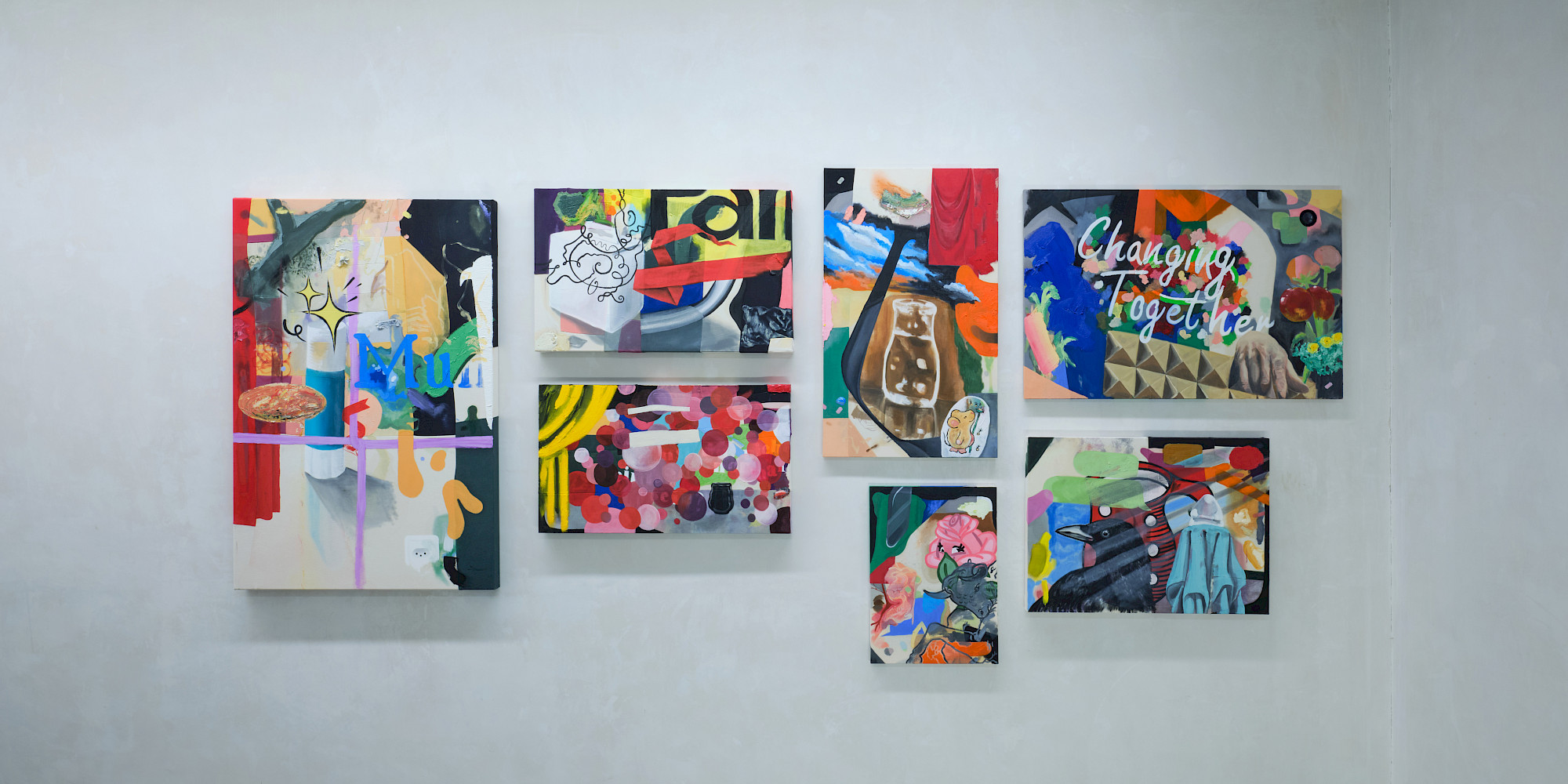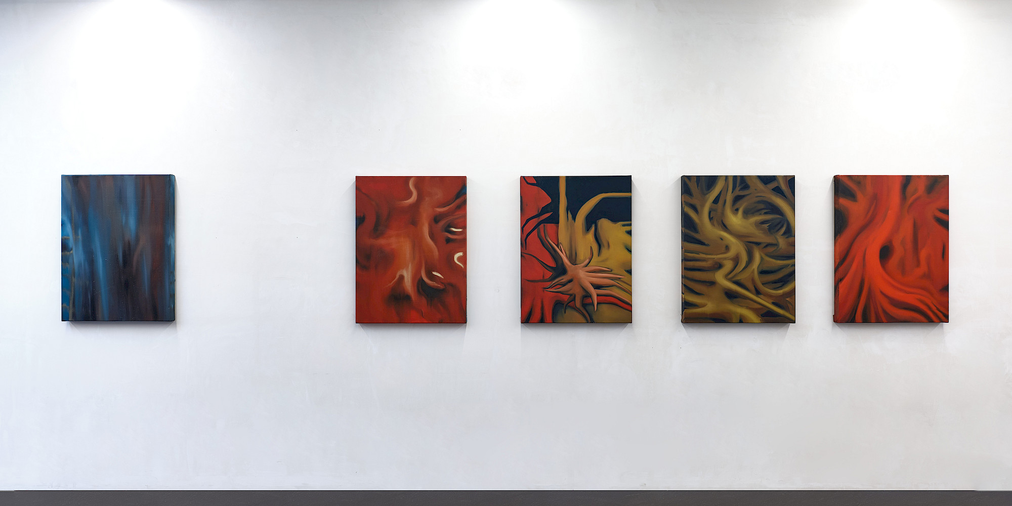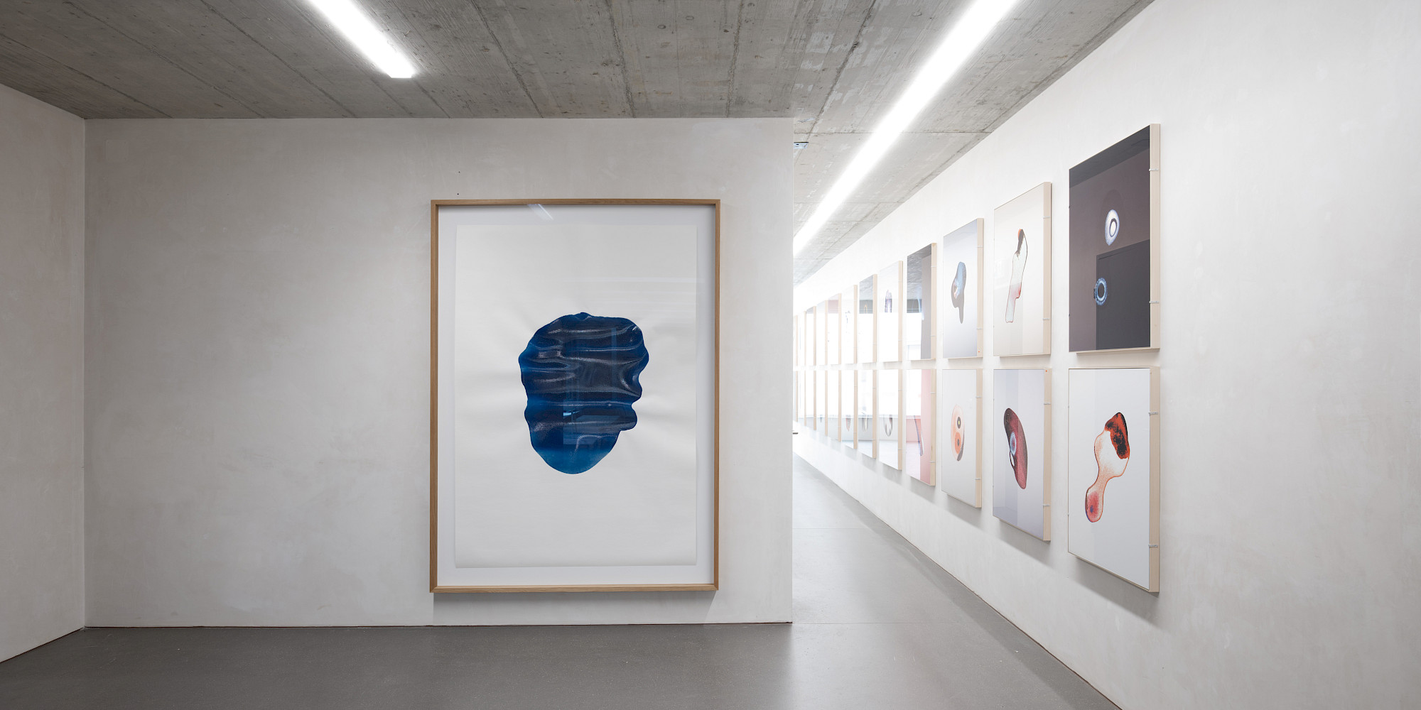 Über die Leinwand hinaus verfolgt er sein Interesse an Wahrnehmungsverschiebungen in den Spiegel-Anamorphosen: runde Kartonobjekte mit zentraler Spiegelfolie. Diese Objekte sind keine Abkehr von der Malerei, sondern eine Fortführung ihres Vokabulars – ein Experiment darüber, wie Bildordnung durch Material, Blickachse und Standpunkt entsteht und wie wenig es braucht, um zwischen Gegenständlichkeit und Abstraktion, Nähe und Distanz zu changieren. In diesen Arbeiten wird Sehen zur körperlichen Handlung.